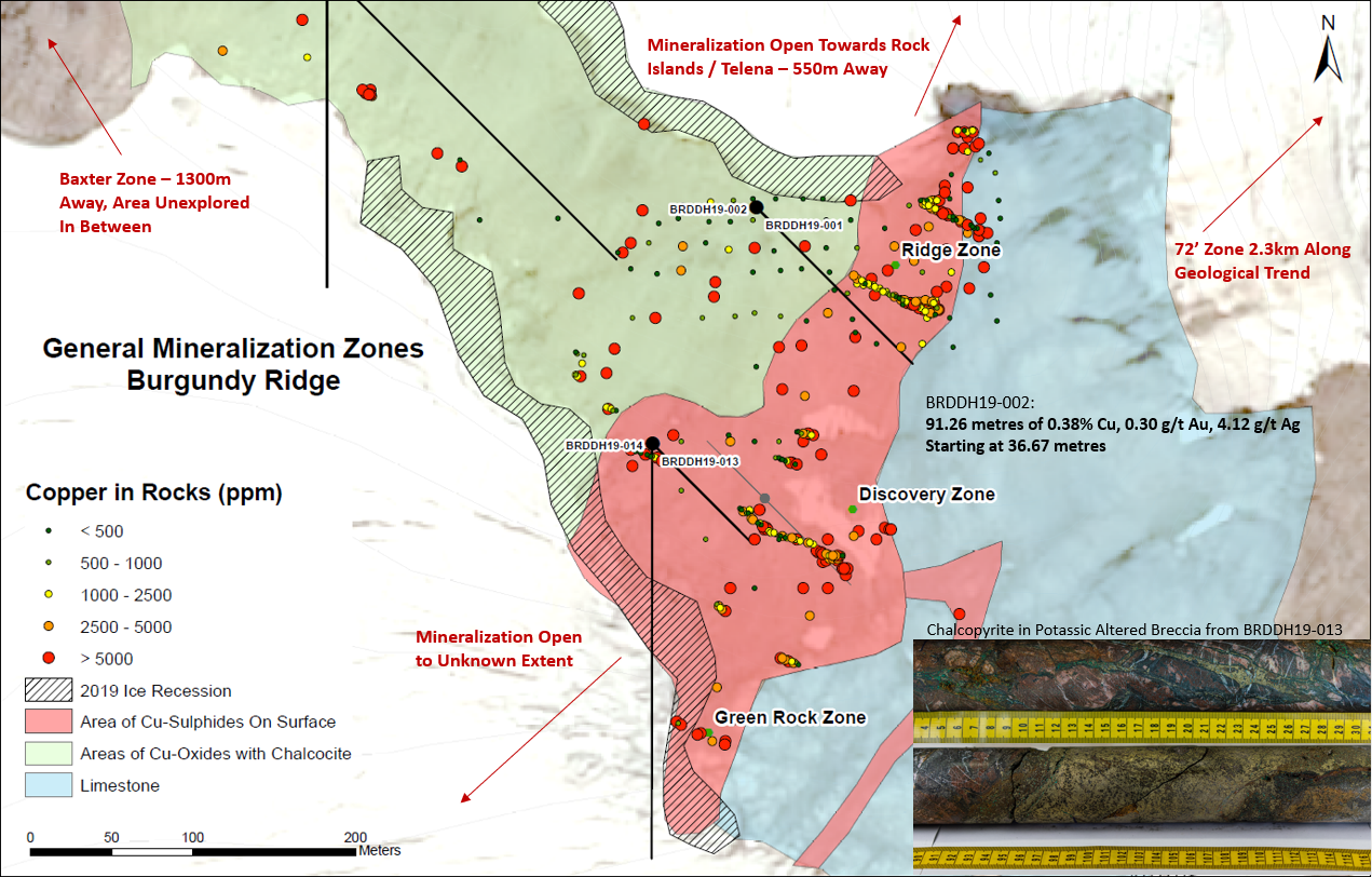 Rapidly receding glaciers at Burgundy continue to expose new mineral showings on surface. Three new surface showings of significance were discovered in 2019 that were previously covered by ice and snow. These showings range from potassic altered, chalcopyrite mineralized megacrystic syenites, to hydrothermal chalcopyrite and sphalerite cement breccias with potassic altered, chalcopyrite mineralized clasts observed discontinuously over a 1,100-metre strike length.
