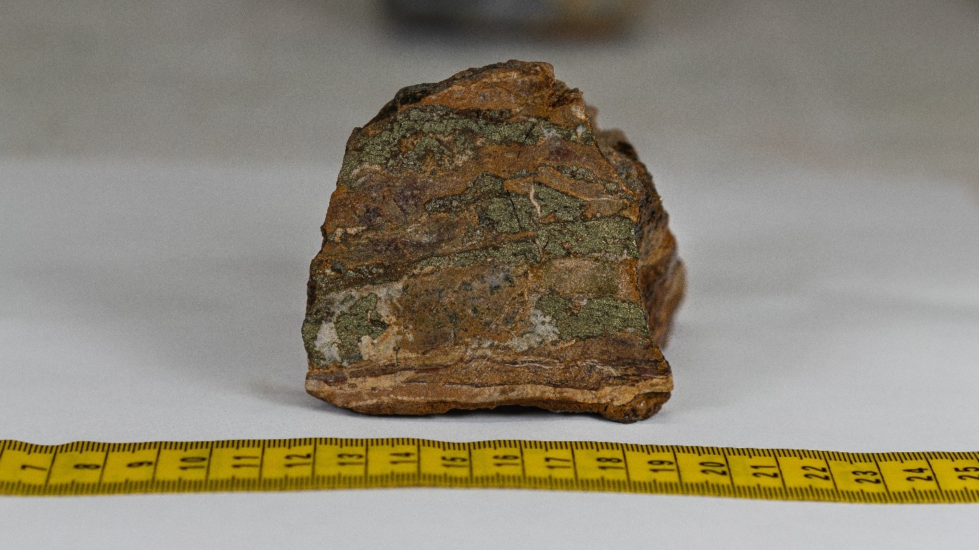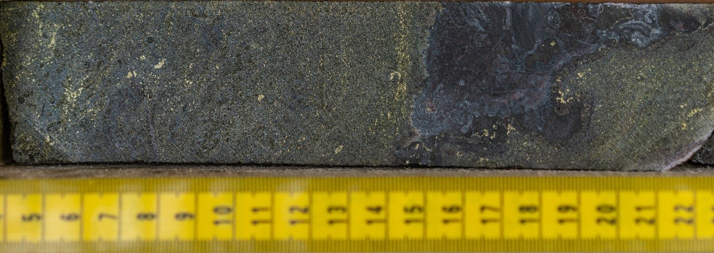 Representative sample of “blebby” chalcopyrite mineralization within “skarn-type” mineralization in Ridge Zone Hole #2 (BRDDH19-002).
