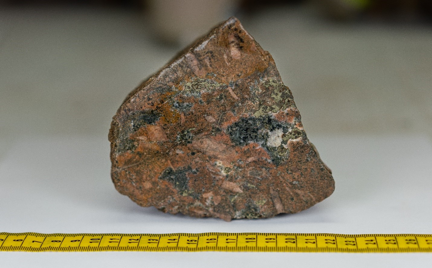K-feldspar altered megacrystic syenite with chalcopyrite mineralization found in outcrop at “Rock Island II”, a new showing ~470 metres NE of Burgundy Ridge exposed by rapidly receding glaciers.