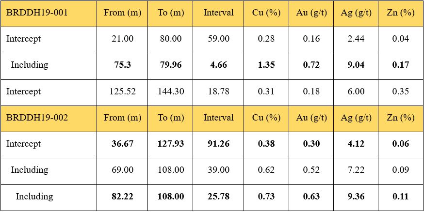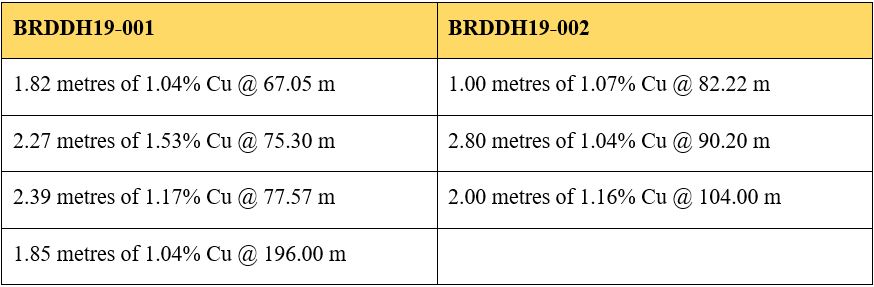- BRDDH19 002 (Hole #2 on the Ridge Zone): 91.26 metres of 0.38% Cu, 0.30 g/t Au, 4.12 g/t Ag starting at 36.67 metres (Table 1).